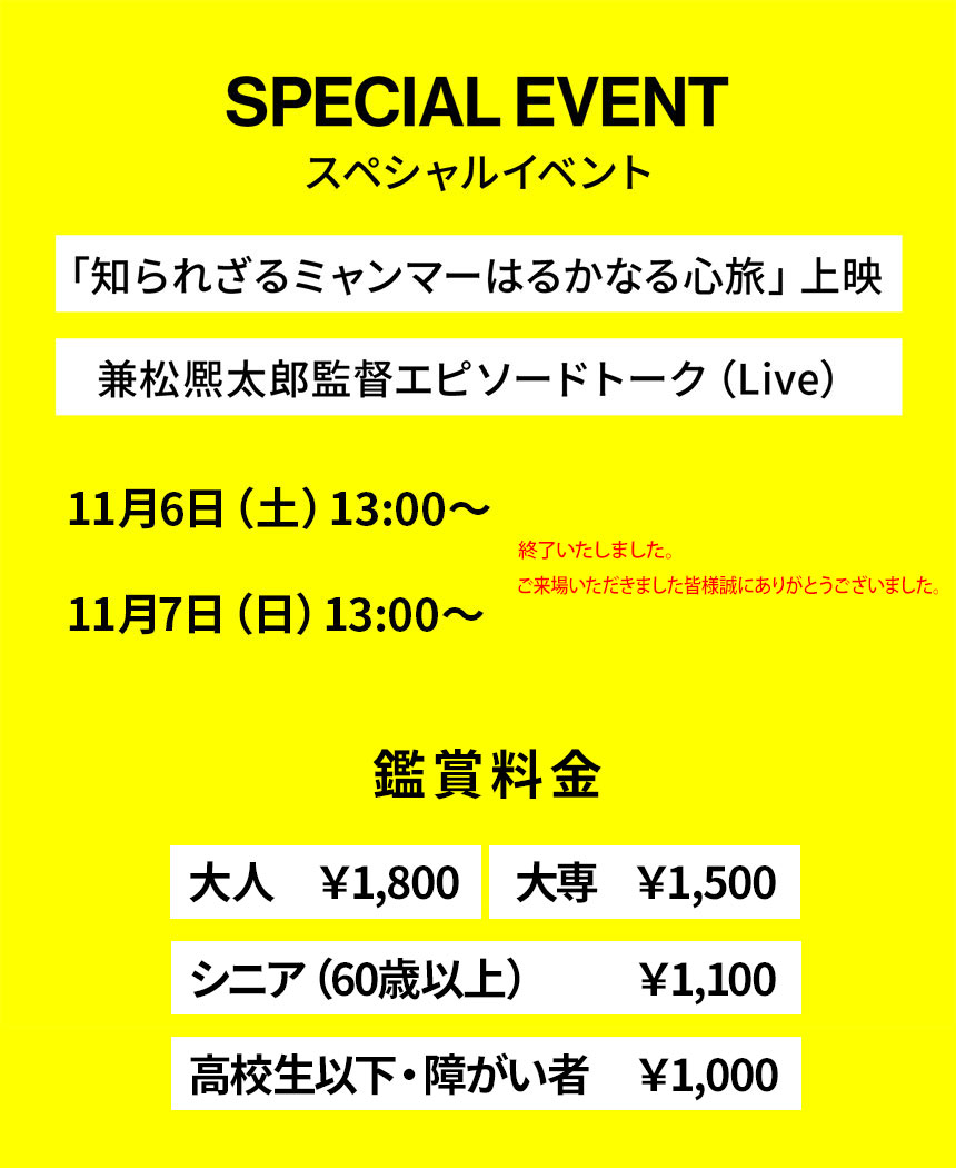 語るのは兼松熈太郎監督。ミャンマーでのエピソードを話して頂けます。トークショーというより、一緒に語り合う場でありたいと思っています。
